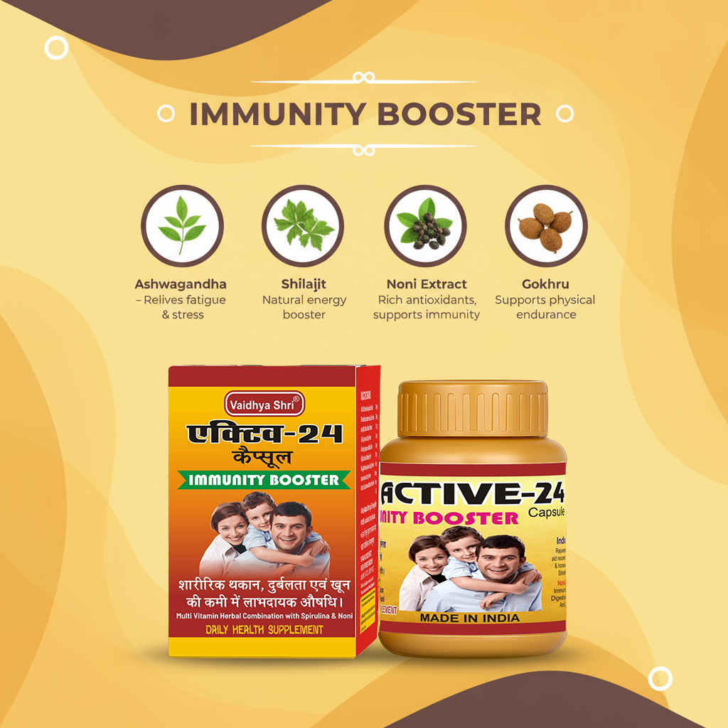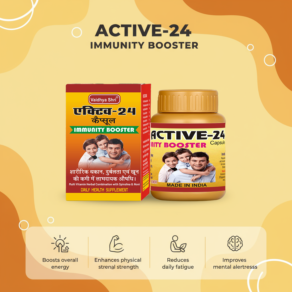Active 24 Capsules are a one-of-a-kind daily Ayurvedic supplement formulated to enhance energy, focus, and overall well-being. With a unique combination of vitamins, herbs, and noni fruit, this blend supports both physical endurance and mental clarity. Enriched with Ashwagandha, Spirulina, Noni Extract, and Wheatgrass, Active 24 helps you stay energized, healthy, and active throughout the day.