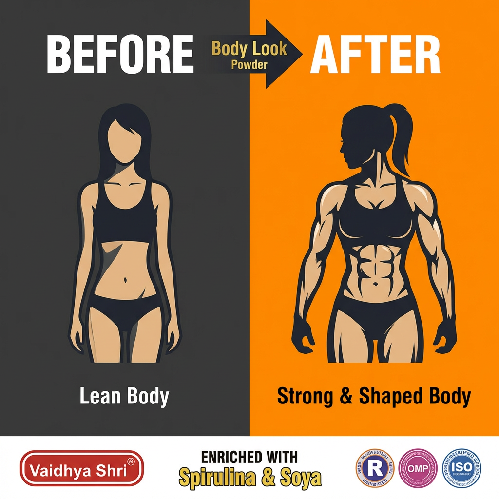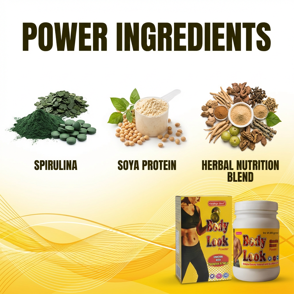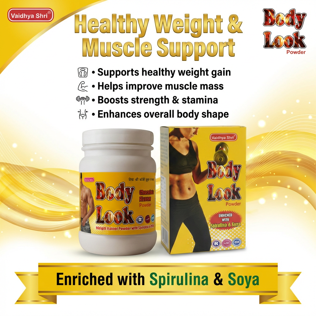 Vaidhya Shri® Body Look Powder ek balanced nutritional formula hai jo body ko essential proteins, micronutrients aur plant-based nourishment provide karta hai. Spirulina aur Soya™ ke powerful combination ke saath yeh powder daily stamina, strength aur overall wellness support karta hai.