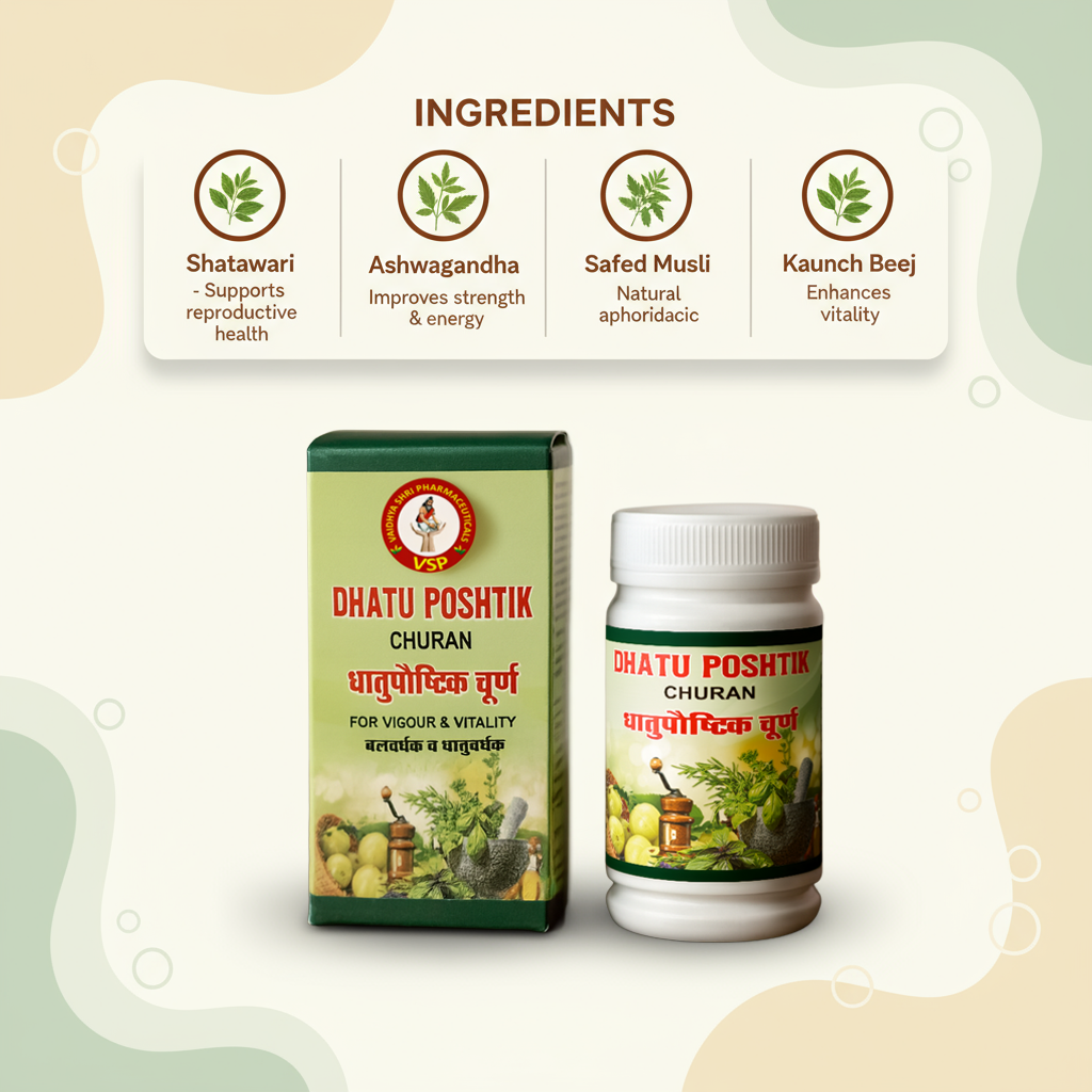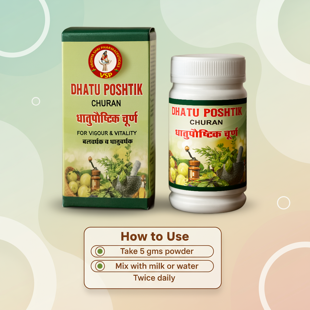 Dhatupostik Powder is a premium Ayurvedic blend formulated to support dhatu (tissue) nourishment, strength, vitality, and healthy energy levels. With a combination of potent herbs, this powder helps improve stamina, supports reproductive wellness, and boosts overall physical performance.