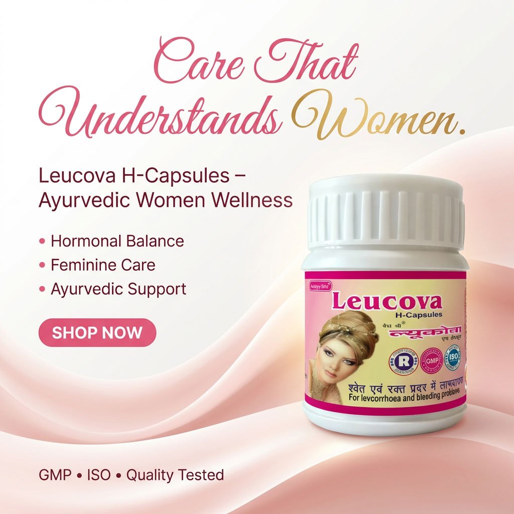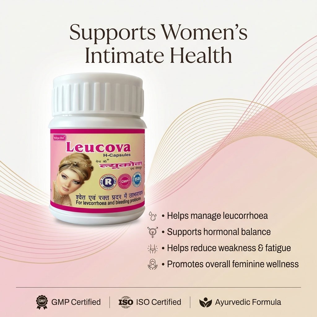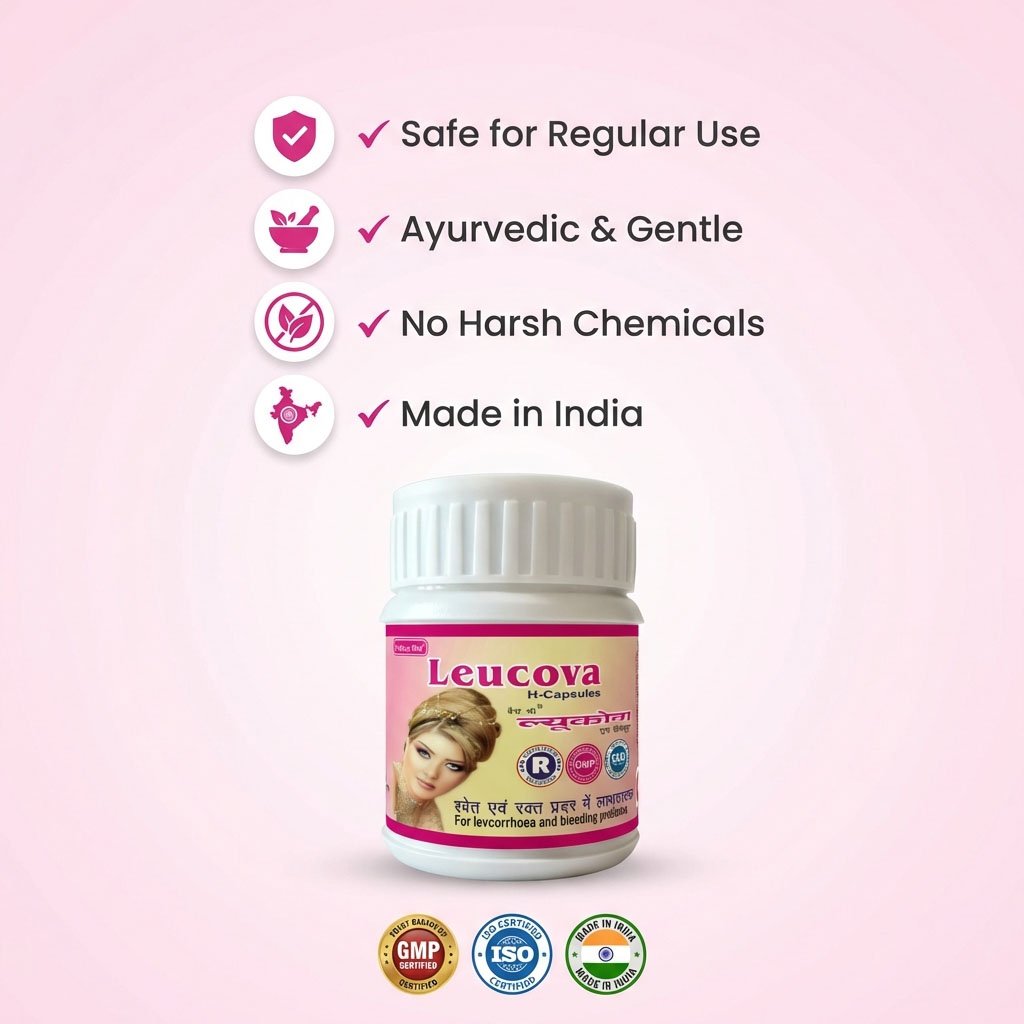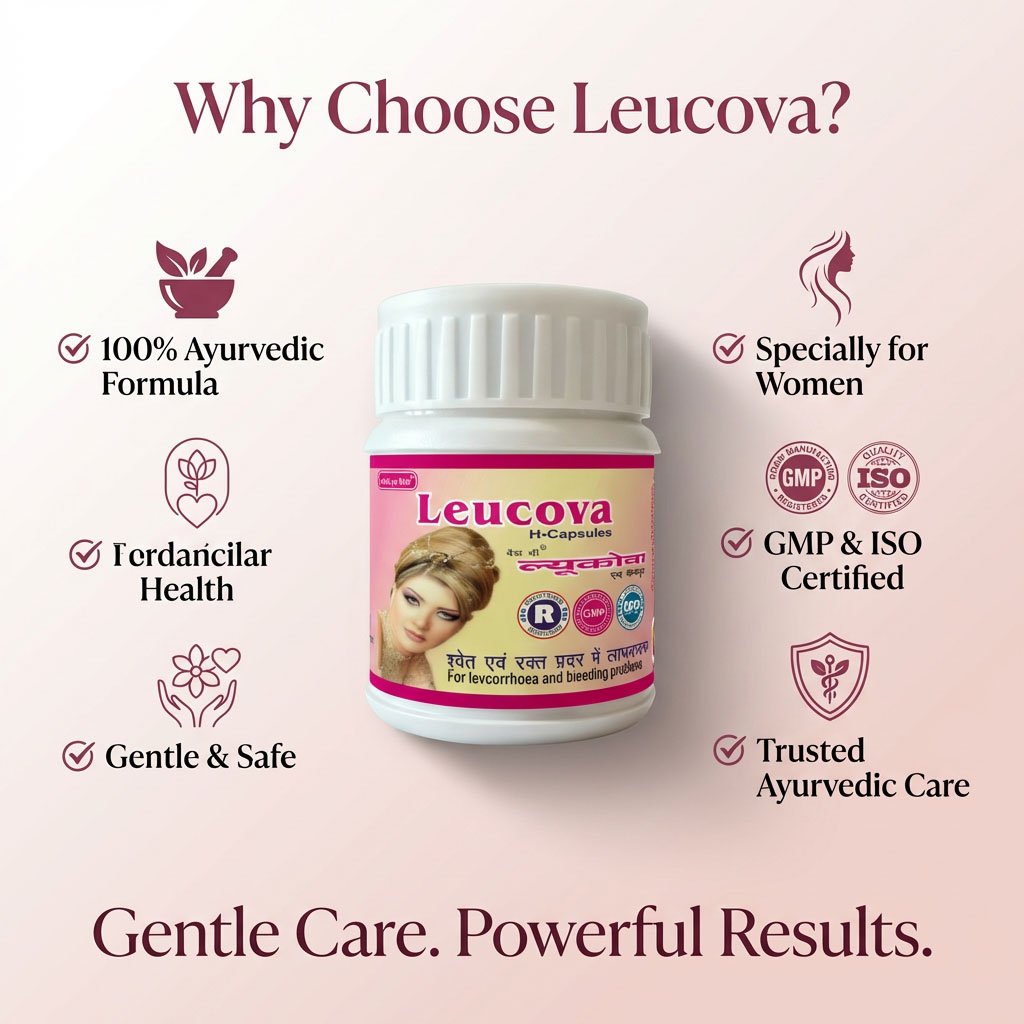 Leucova H Capsules are a carefully formulated Ayurvedic supplement developed to provide natural support for women’s reproductive health. Traditionally used to help manage leucorrhoea (white discharge) and associated weakness, this herbal formulation supports internal balance and overall vitality.