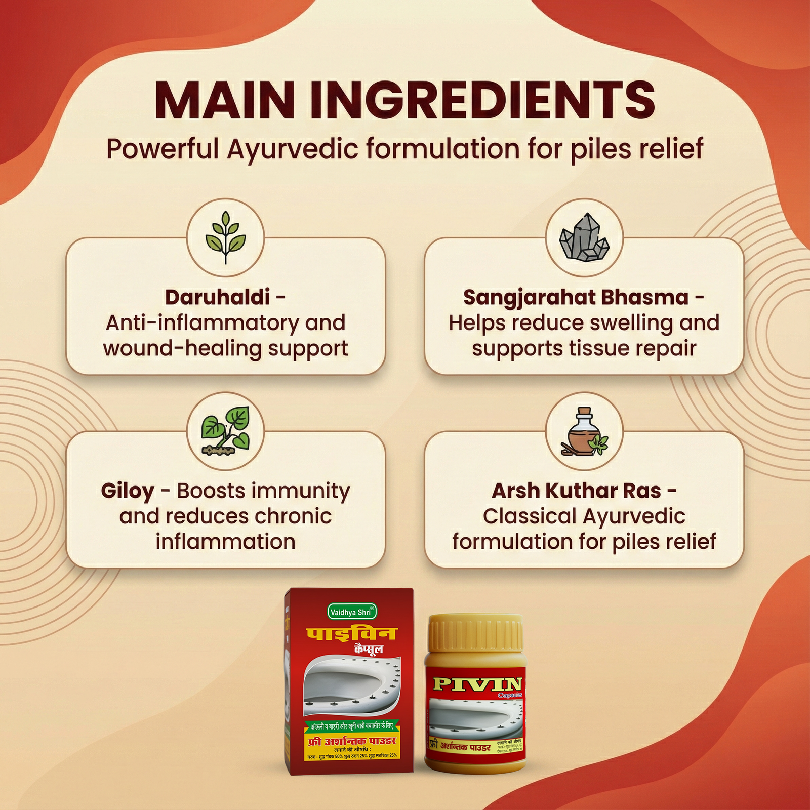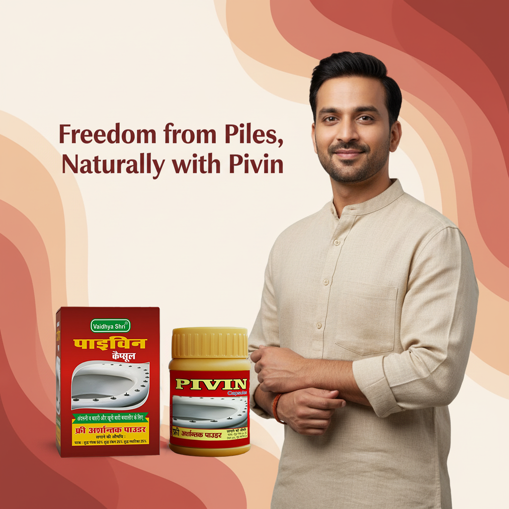 Pivin Capsules is a powerful Ayurvedic formulation designed to support people suffering from piles (hemorrhoids) and related digestive discomforts. It works naturally to reduce pain, swelling, bleeding, and constipation while supporting digestive and liver health.