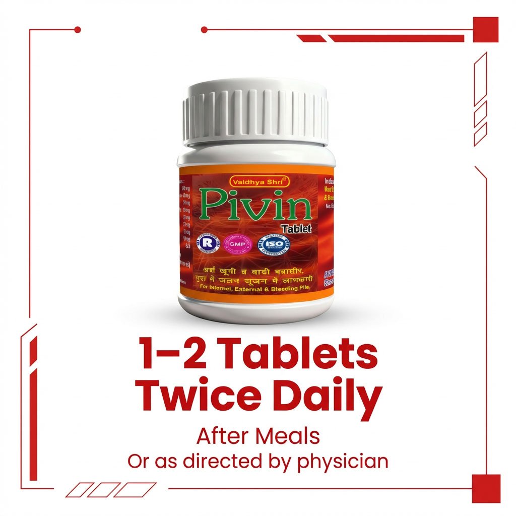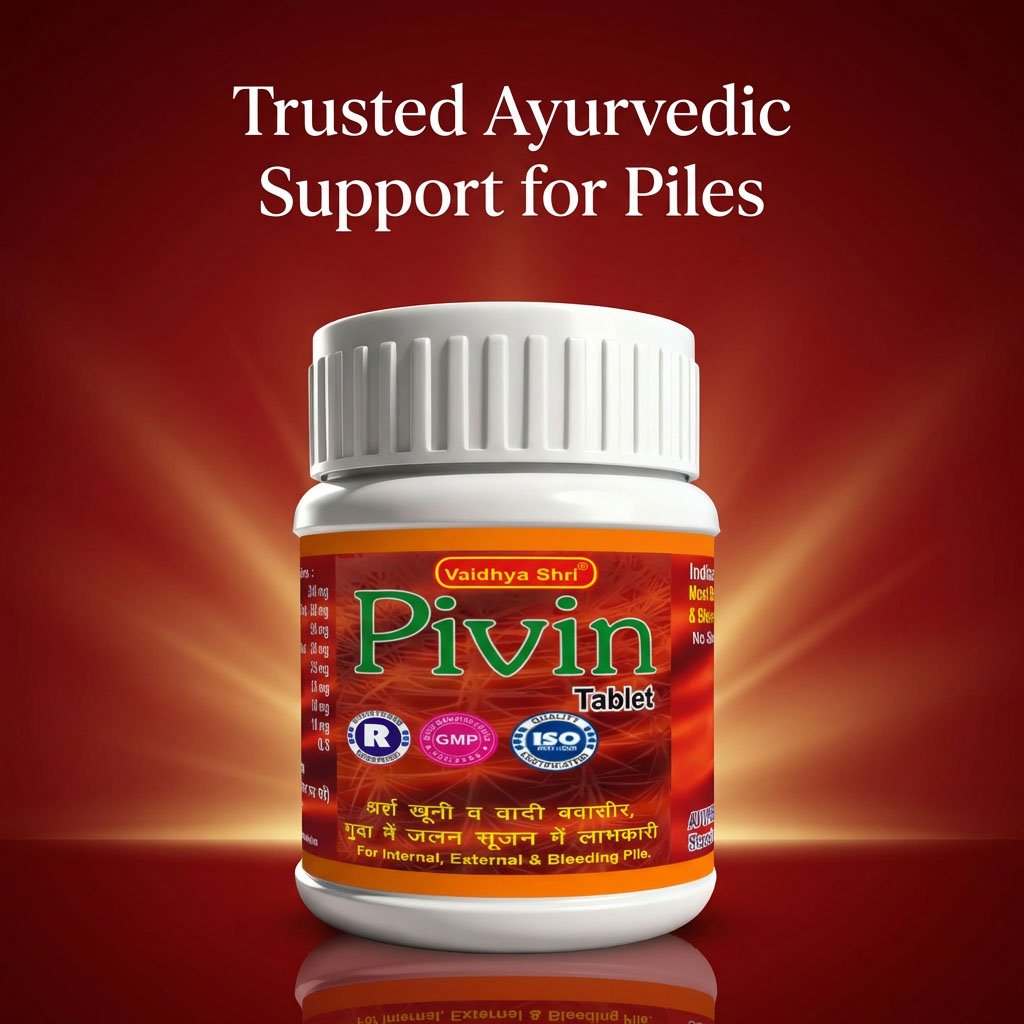 Pivin Tablets are a traditional Ayurvedic formulation developed to provide natural support in managing symptoms associated with piles (hemorrhoids), including internal, external, and bleeding conditions.